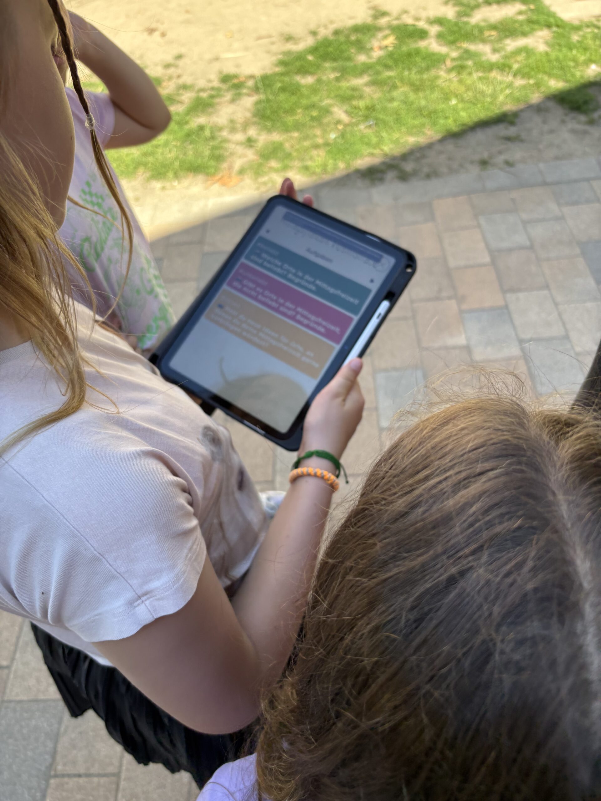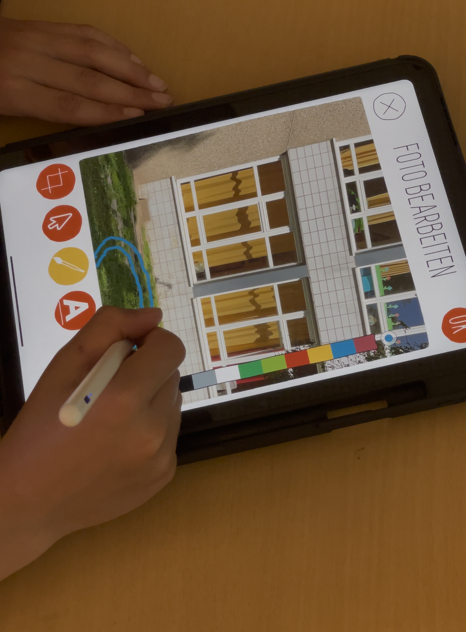 Jede Gruppe bekommt ein Tablet und erkundet damit das Schulgelände. Mit der App können die Schüler:innen alles fotografieren oder filmen, was ihnen wichtig oder spannend vorkommt. Am besten machen sie das nicht während der Mittagsfreizeit, sondern während der Unterrichtszeit – dann sind die Kinder ungestört und können sich, ohne Ablenkung durch andere Schüler:innen, auf die Erkundung von Orten konzentrieren.