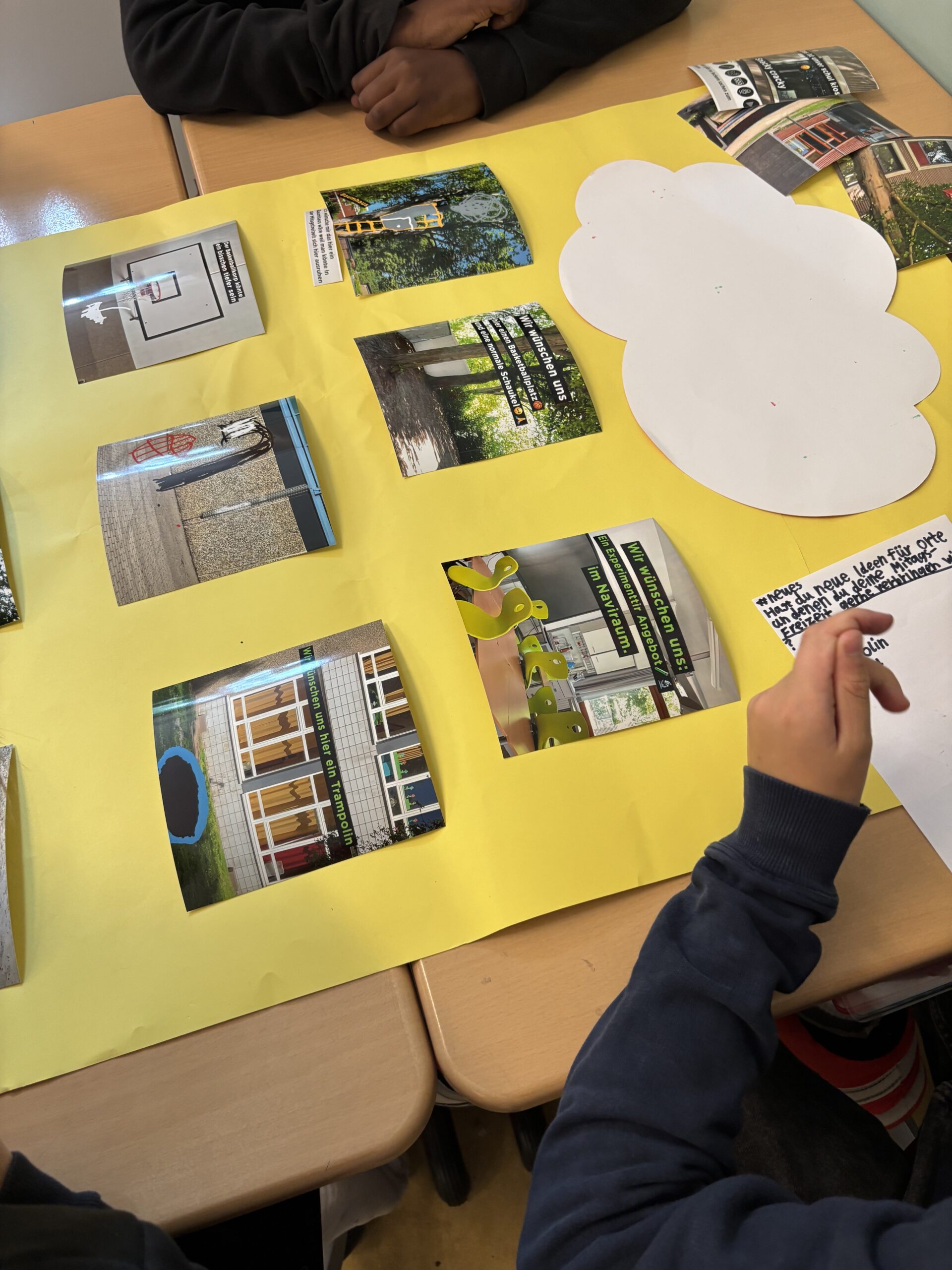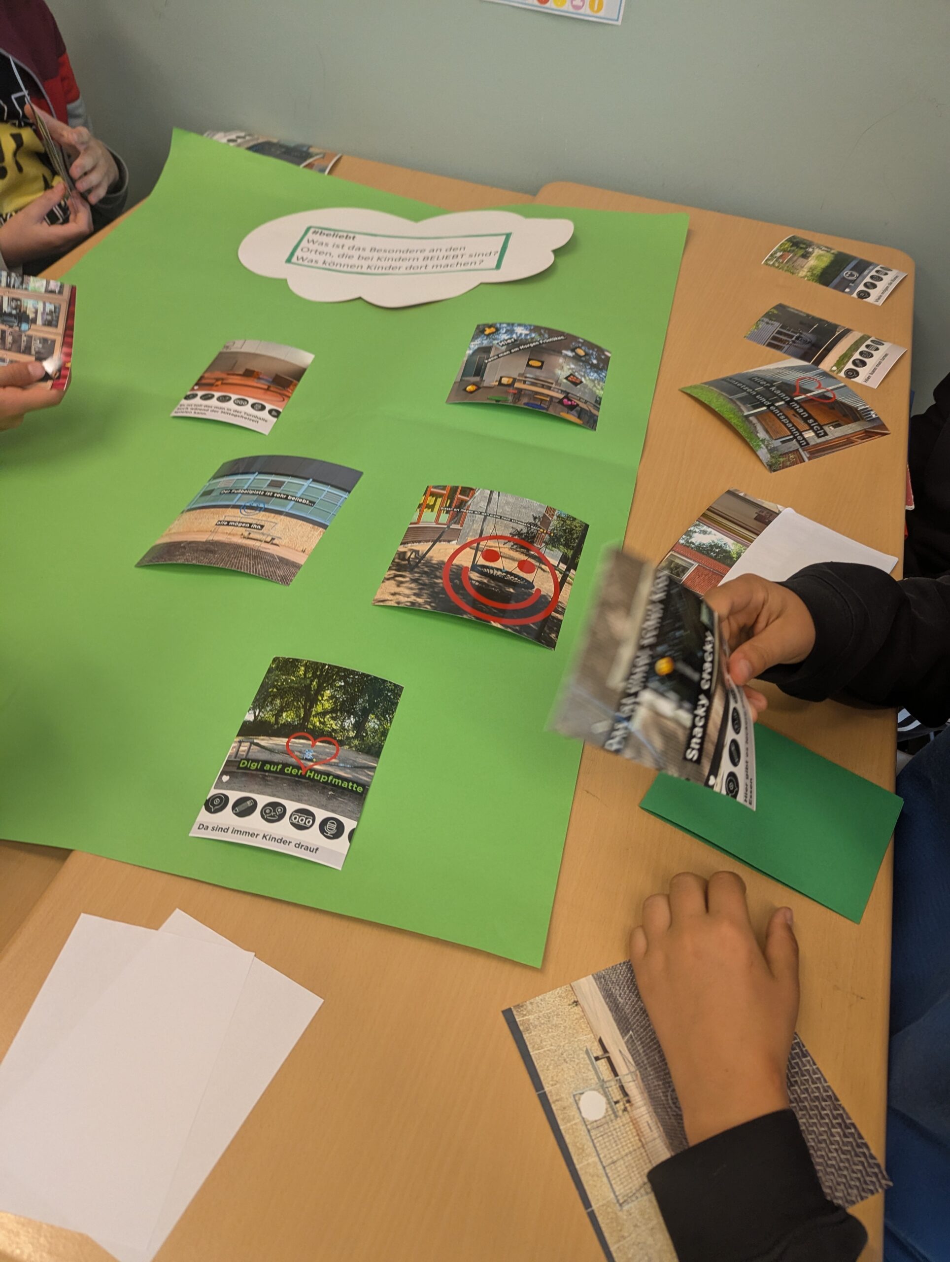 Am ersten Projekttag werden die Schüler:innen aktivierend an das Thema Mittagsfreizeit herangeführt. Im Mittelpunkt steht erst einmal die Frage: Welche Orte sind in der Mittagsfreizeit beliebt? Um die Perspektiven und Erfahrungen der Kinder sichtbar zu machen, eignet sich die Methode Platzdeckchen (Platzdeckchen unter Materialien). Diese kooperative Arbeitsform ermöglicht es den Schüler:innen, ihre individuellen Gedanken zunächst eigenständig zu entwickeln und anschließend in ihrer Gruppe (vier Schüler:innen) zu teilen. Die gesammelten Orte werden danach auf Post-its festgehalten und im Plenum thematisch geclustert und visualisiert. In der anschließenden Gesprächsphase wird das Thema Mittagsfreizeit weiter vertieft: Warum sind diese Orte bei Kindern beliebt? Welche Aktivitäten sind dort möglich? Welche Bedürfnisse von Kindern werden dort erfüllt (z.B. Bewegung, Ruhe, Gemeinschaft, Rückzug)?