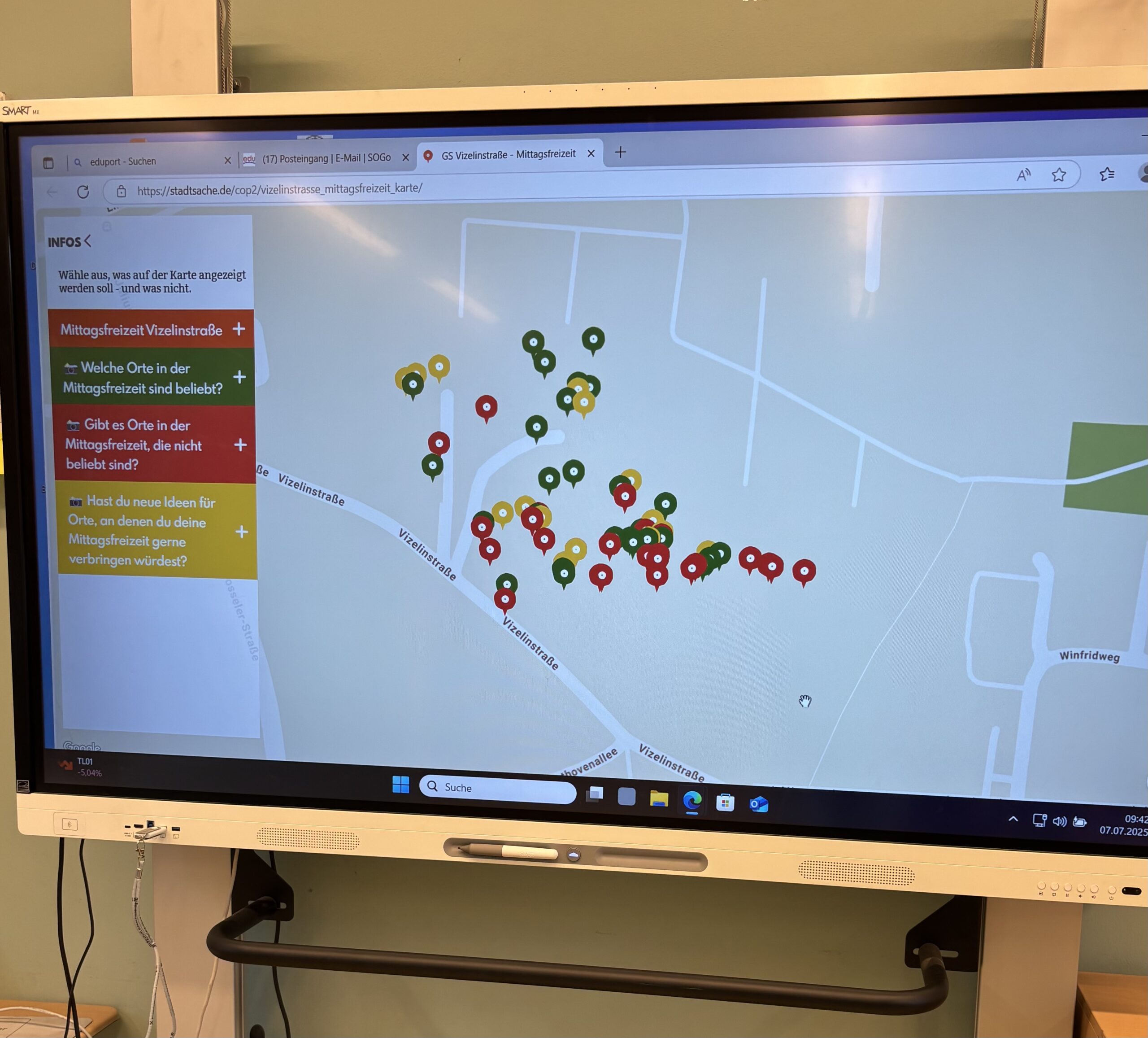 Nach der Erkundung schauen die Gruppen ihre Aufnahmen gemeinsam an. Oft müssen die Aufnahmen noch ein bisschen bearbeitet werden, weil während der Erkundung nicht genug Zeit dafür bleibt. Sie können Texte, Audios oder Zeichnungen hinzufügen – und versehentlich gefilmte Gesichter lassen sich mit Smileys abdecken. Am Ende fließen alle ausgewählten und bearbeiteten Aufnahmen in eine digitale Karte ein, die zeigt, wie die Kinder die Mittagsfreizeit erleben.