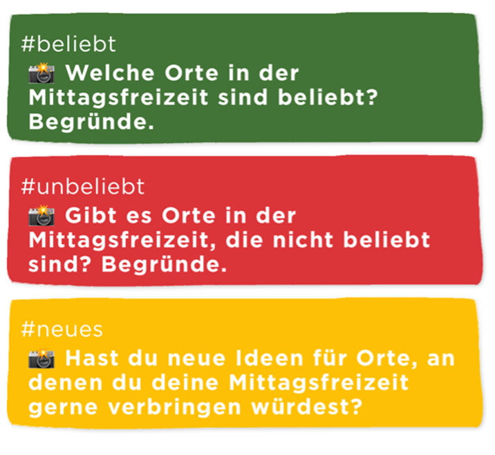 Es ist sinnvoll, die Aufgaben in der App gemeinsam mit den Kindern zu besprechen. Dabei kann noch einmal daran erinnert werden, was die Kinder am ersten Projekttag zu beliebten und unbeliebten Orten in der Mittagsfreizeit herausgefunden haben.