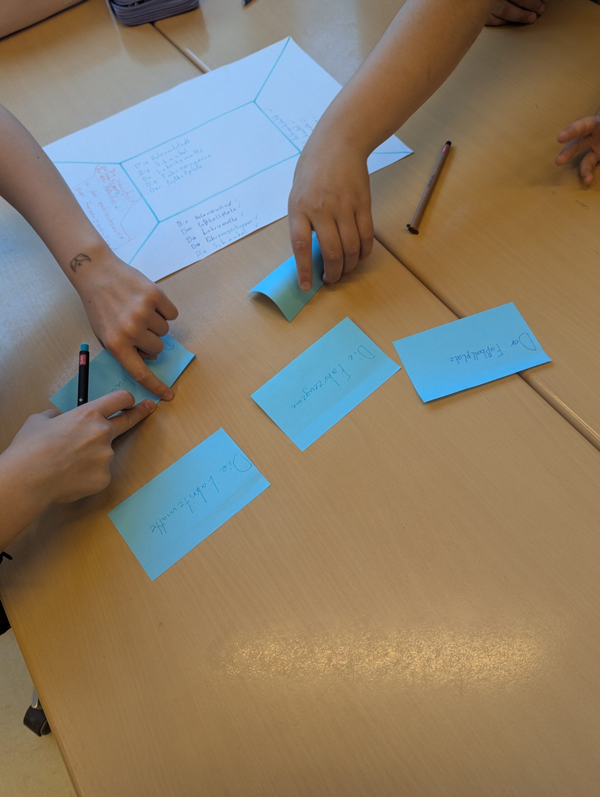 TIPP: Für die Platzdeckchen-Methode empfehlen sich größere Papierbögen (DIN A3). Für die Clusterung der Orte können Post-its in unterschiedlichen Farben verwendet werden: z.B. unterschiedliche Farben für Ortstypen (Draußen-Orte, Drinnen-Orte, Rückzugsorte, Gemeinschaftsorte) oder Aktivitätstypen (Bewegung, Sport, Entspannung, Kreatives, Spielen).