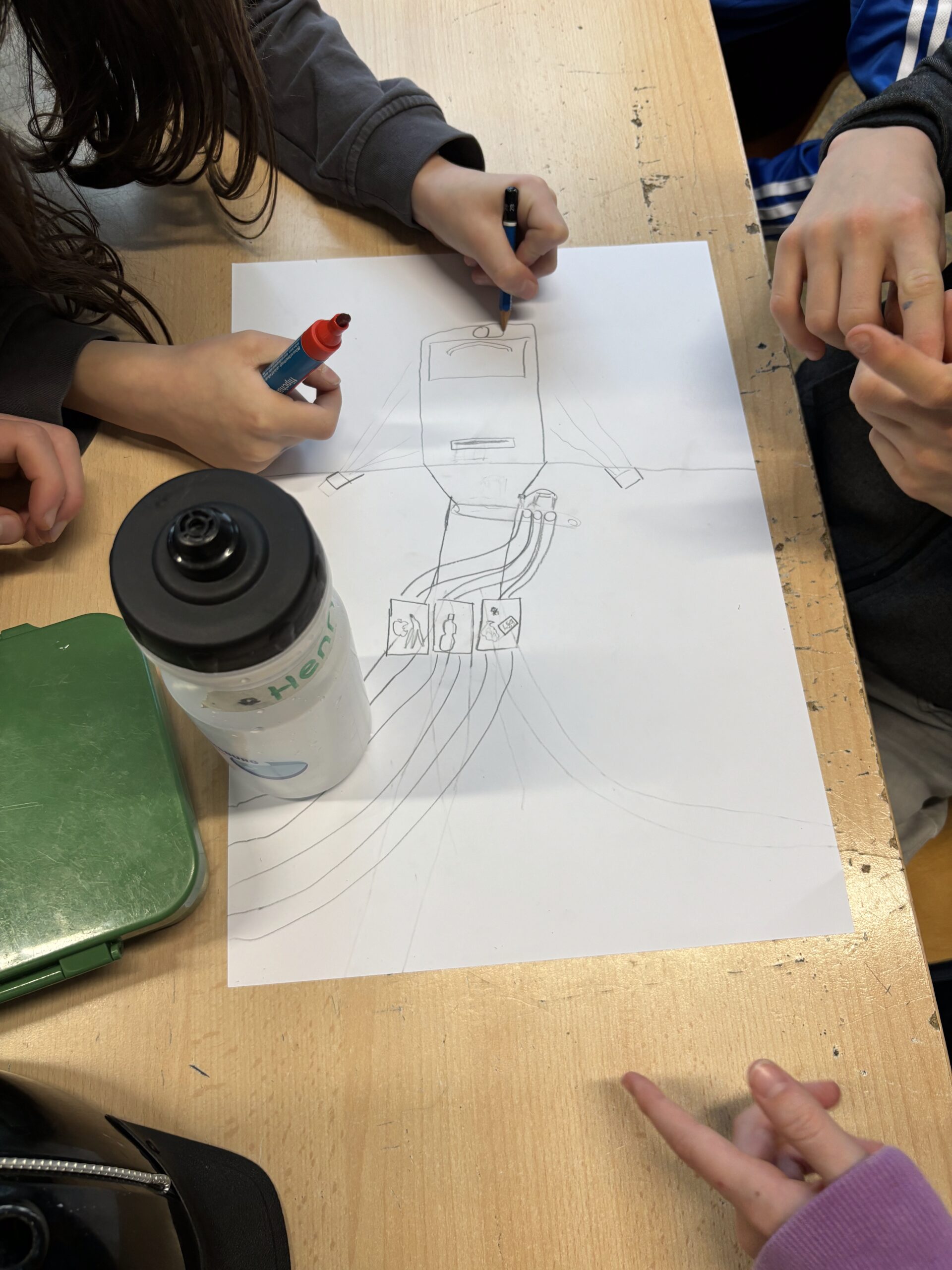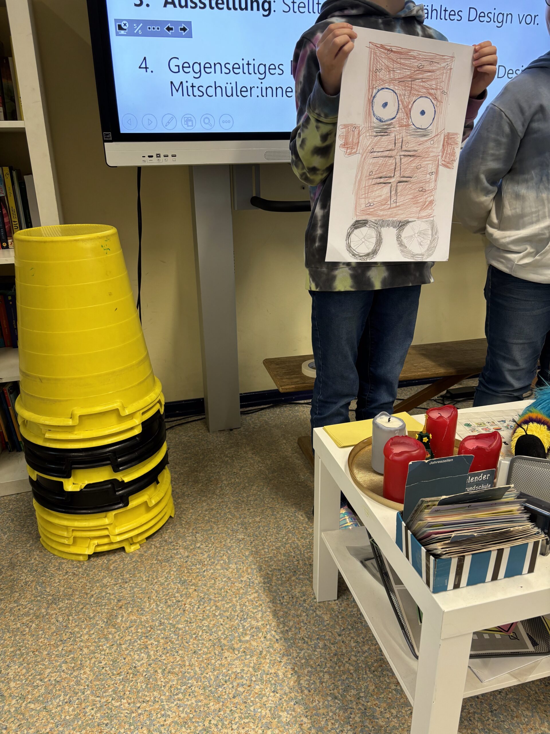 - Aufgabenstellung – Der perfekte Mülleimer: Auf Grundlage der zuvor im Plenum gesammelten Eigenschaften gestalten die Schüler:innen alleine oder in Gruppen ihren jeweils ,perfekten‘ Mülleimer (Aufgabenstellung – Der perfekte Mülleimer unter Materialien). Die entstandenen Entwürfe werden anschließend in einer kleinen Ausstellung präsentiert. Im gemeinsamen Rundgang geben sich die Schüler:innen gegenseitig Feedback, tauschen ihre Eindrücke aus und reflektieren, welche Ideen sie besonders überzeugend, alltagstauglich oder auch originell finden.