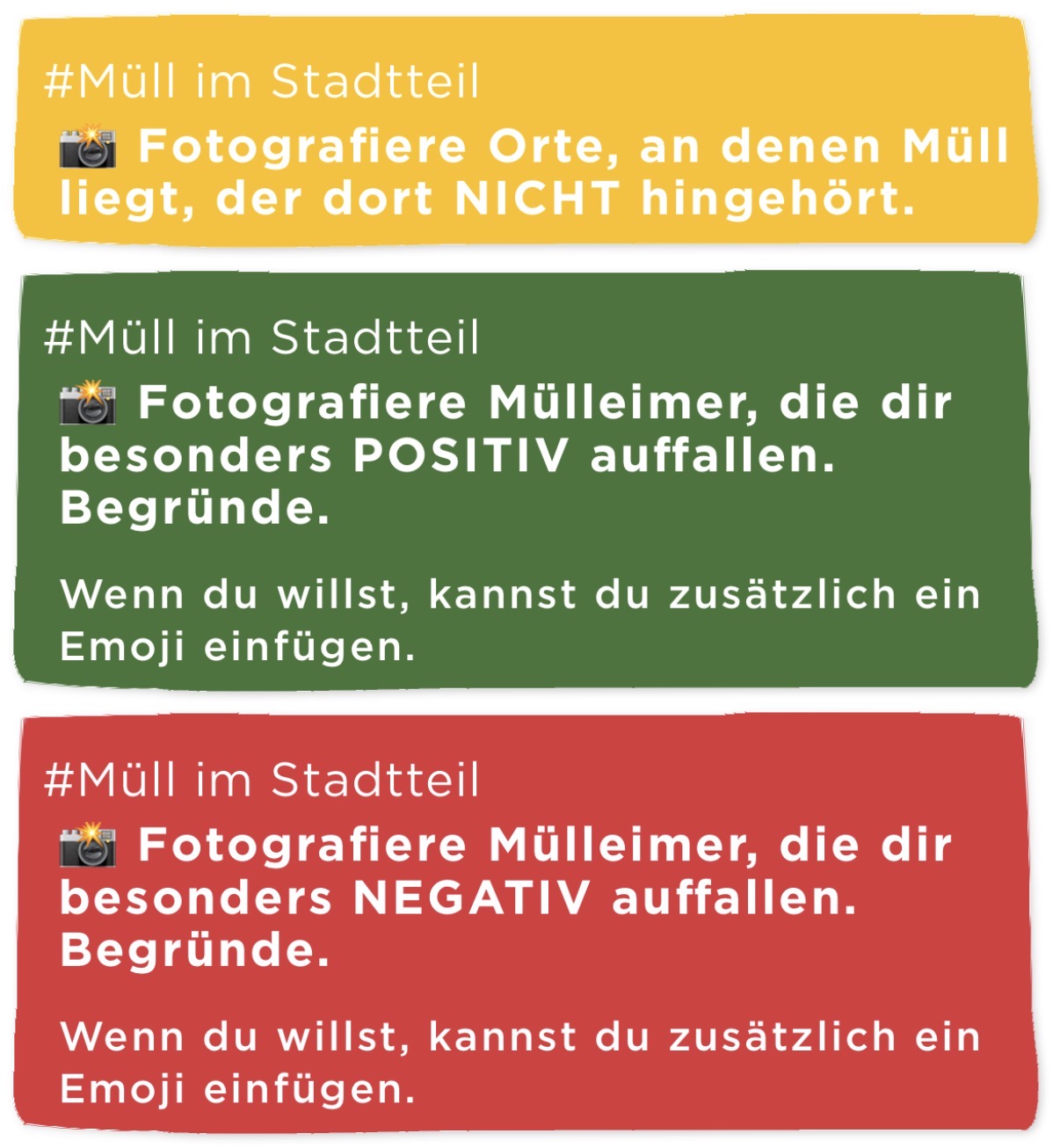 Für den nächsten Tag erhalten die Kinder eine kleine Hausaufgabe, in der sie sich mit folgender Frage beschäftigen sollen: Wo in meinem Stadtteil liegt besonders viel Müll?