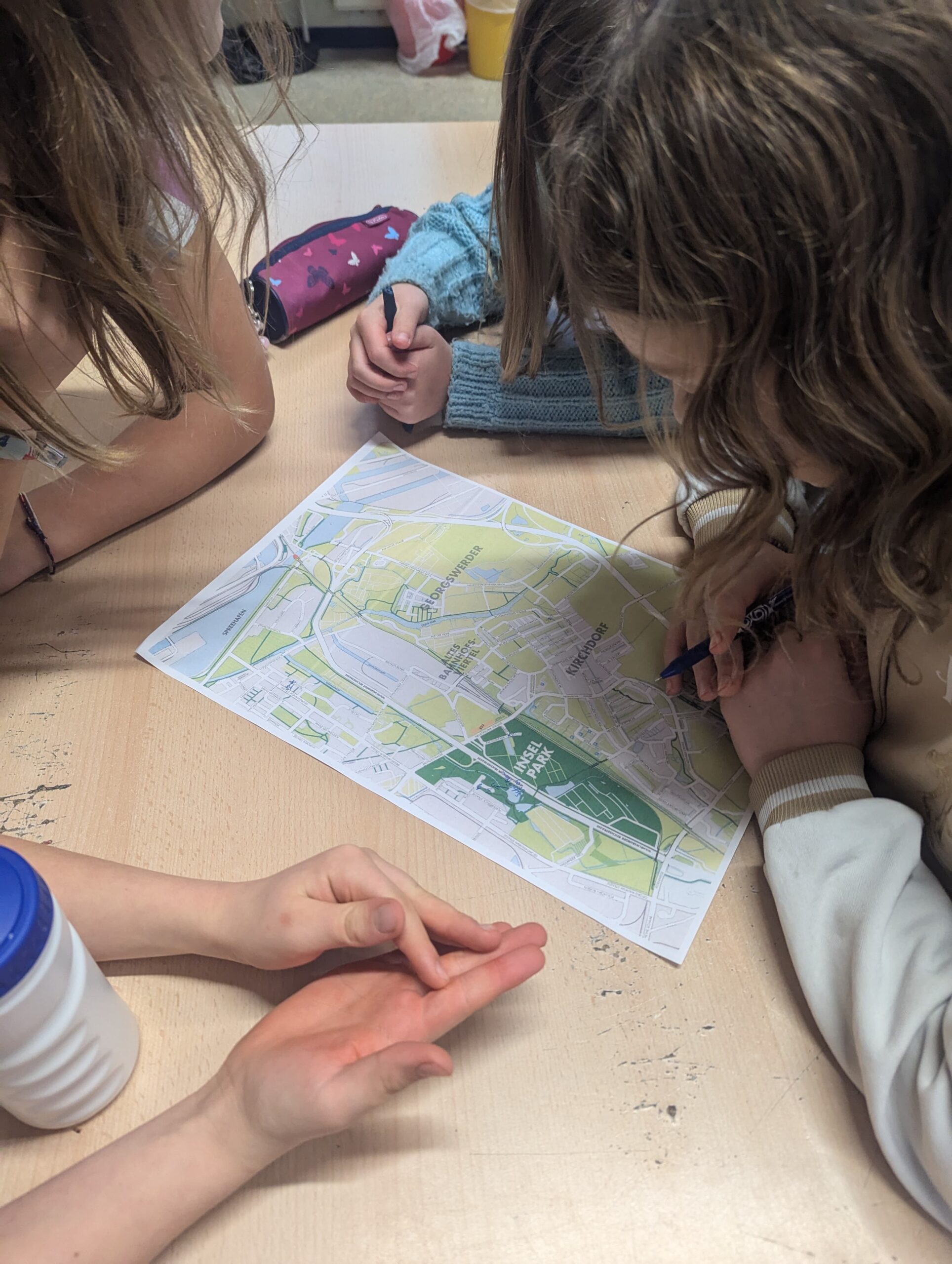 Am ersten Projekttag werden die Schüler:innen an das Thema Müll im Stadtteil herangeführt. Gemeinsam überlegen sie zunächst, wie in ihrem Stadtteil mit Müll umgegangen wird – zum Beispiel, wie viele Mülleimer es gibt, wie diese aussehen, ob Müll richtig getrennt wird oder warum Abfall manchmal auf der Straße liegt. Nach dem Einstieg wurden an der Schule An der Burgweide Gruppen gebildet, in denen Kinder aus unterschiedlichen Wohngebieten zusammenarbeiteten, um mehr über die Lebensrealitäten ihrer Mitschüler:innen zu erfahren. In diesen Gruppen arbeiteten die Schüler:innen zunächst mit analogen Karten (DIN A3). Die Karten zeigten zwei Wohngebiete, in denen die meisten Schüler:innen der Klasse leben: das Wohngebiet Kirchdorf-Süd, eine dicht bebaute Hochhaussiedlung, sowie ein Wohngebiet auf der Elbinsel mit Mehrfamilienhäusern, Reihenhäusern und Wohnblöcken. Die Schüler:innen trugen ihre Wohnorte zusammen, verglichen ihre Wege und entdeckten Gemeinsamkeiten sowie Unterschiede. Die Arbeit mit den analogen Karten sollte den Schüler:innen helfen, sich bei der anschließenden Stadtteilerkundung besser orientieren zu können.