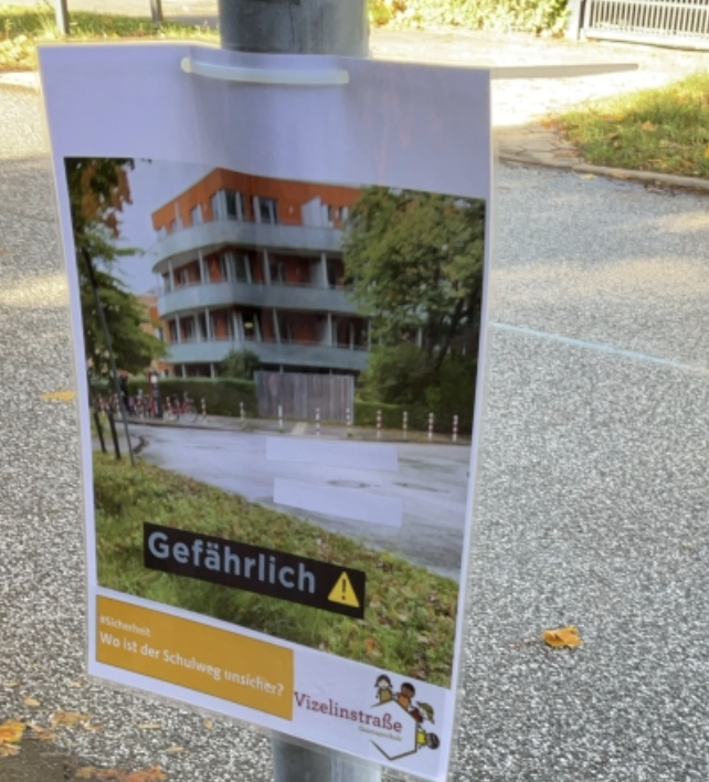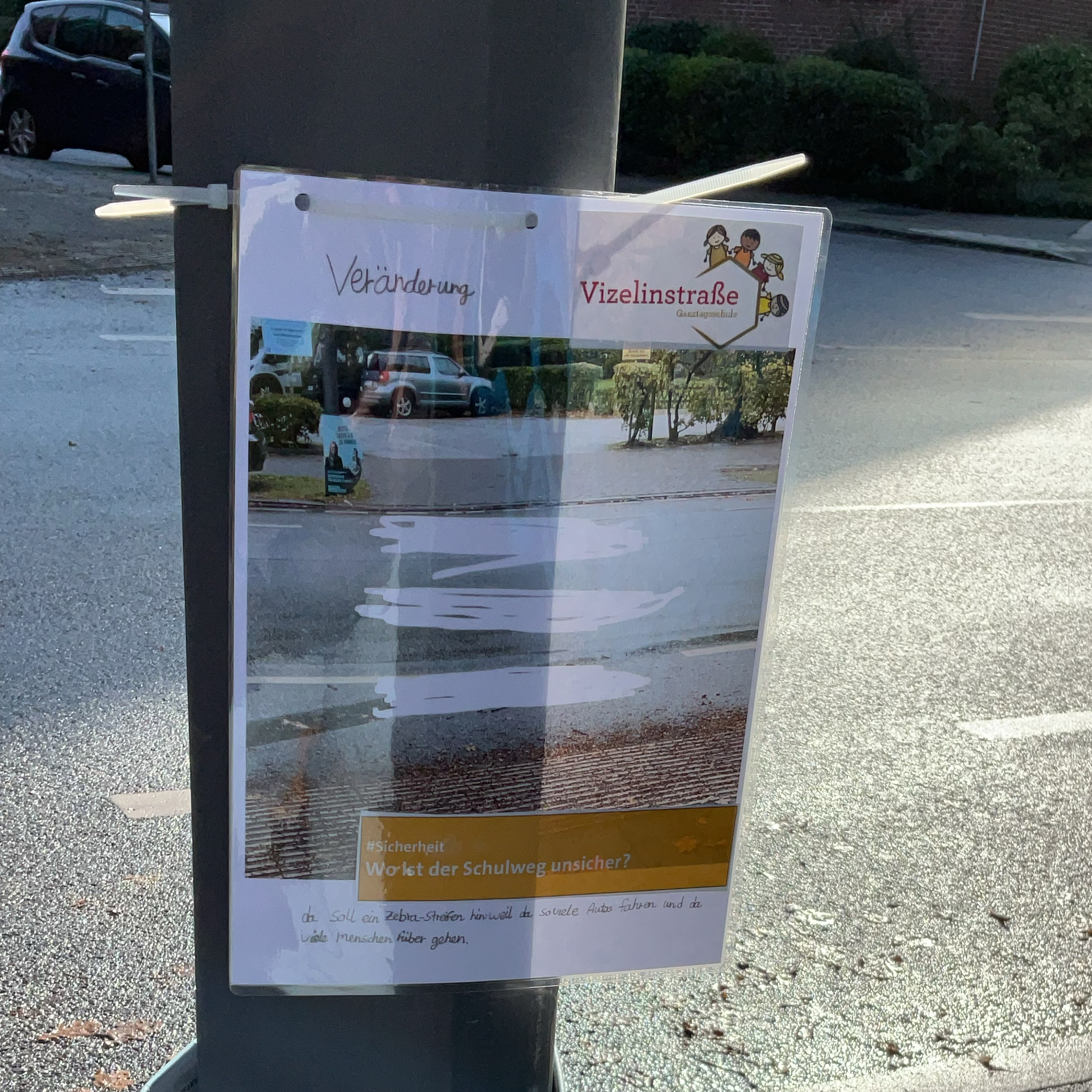 An der Grundschule Vizelinstraße sind die Schüler:innen am letzten Projekttag erneut im Stadtteil unterwegs gewesen und haben dort gezielt die Orte aufgesucht, an denen sie sich unwohl und unsicher fühlen. Dort brachten sie ihre gestalteten und ausgedruckten Fotos an und machen so auf ihre Beobachtungen und Anliegen aufmerksam. Die Fotos verweisen auf Orte, an denen sich die Kinder mehr Sicherheit, Aufmerksamkeit oder Veränderungen wünschen, und richten sich bewusst an andere Menschen im Stadtteil. Indem die Kinder Spuren hinterlassen, erfahren sie, dass ihre Perspektiven Bedeutung haben und öffentlich wahrgenommen werden können.