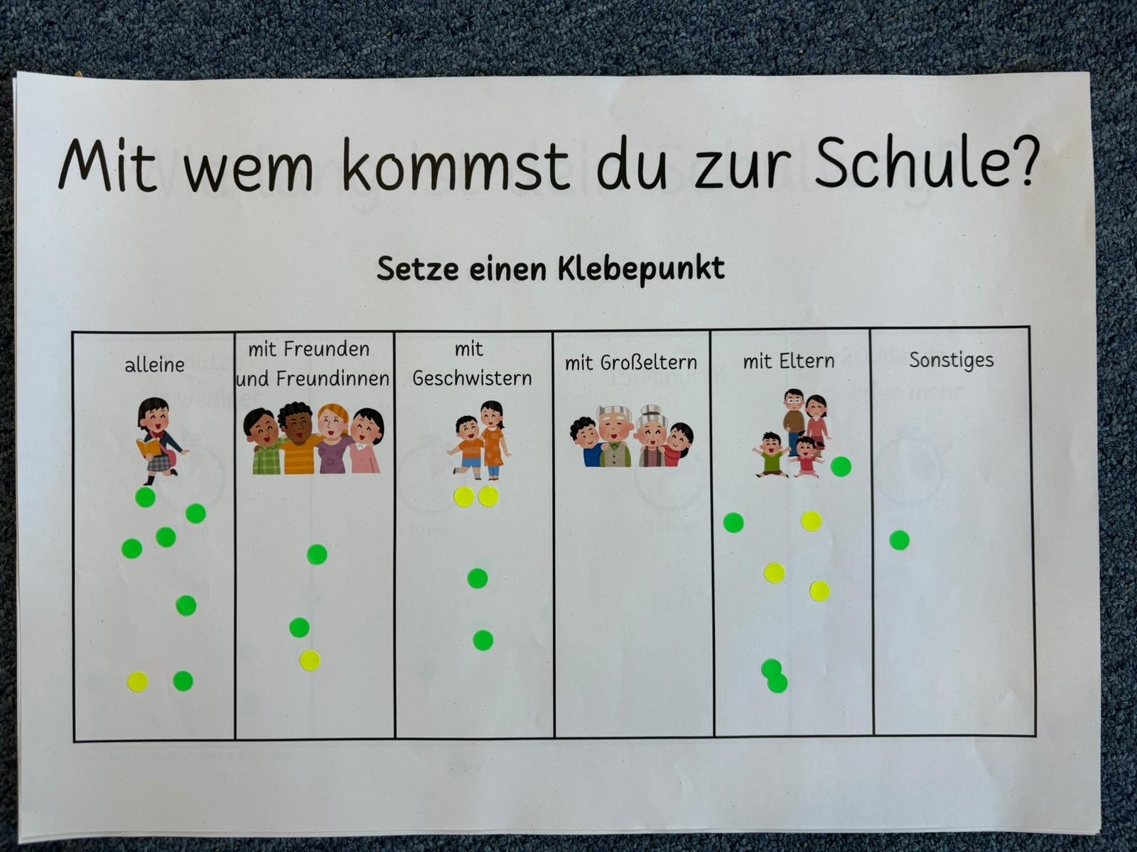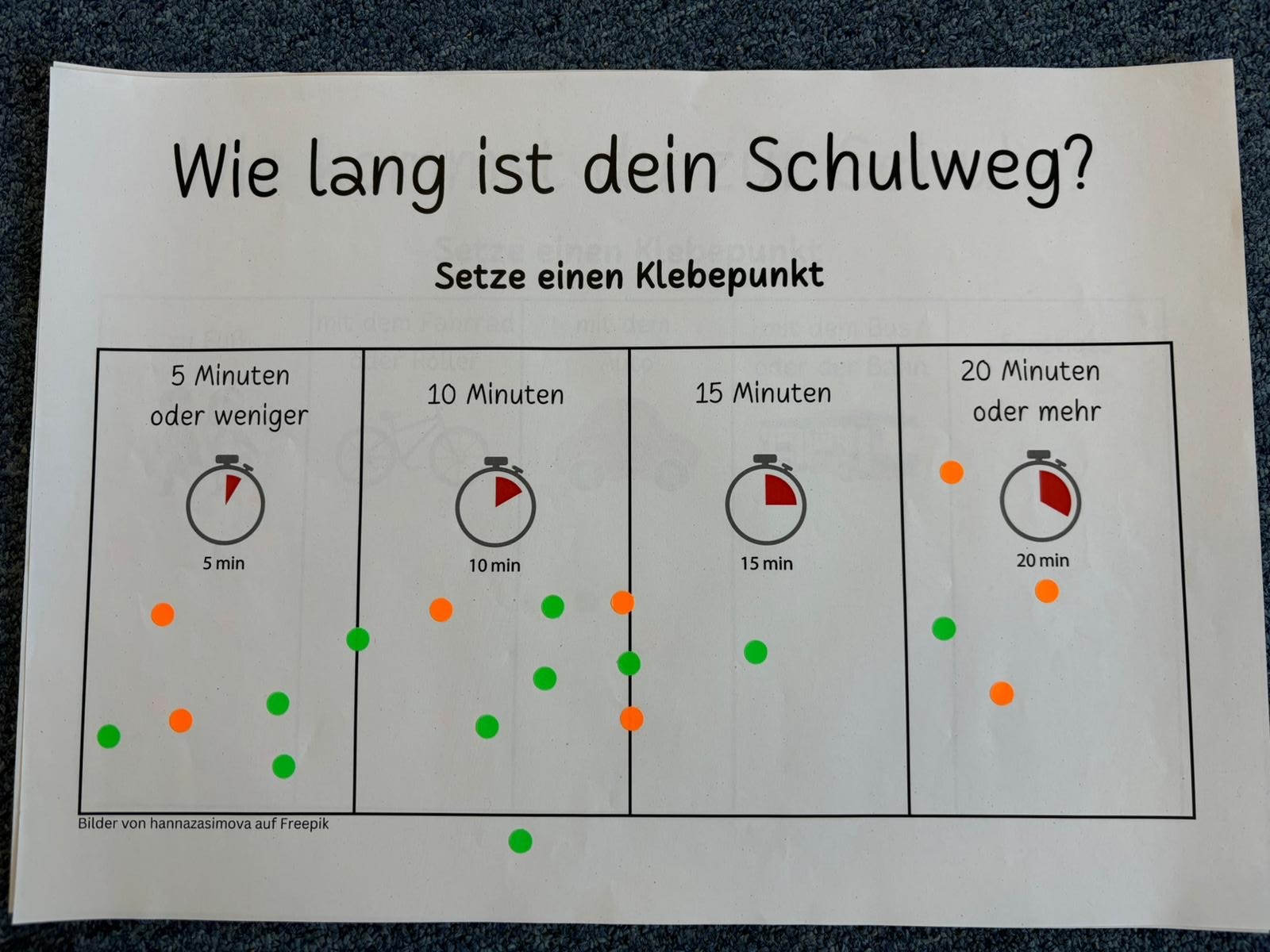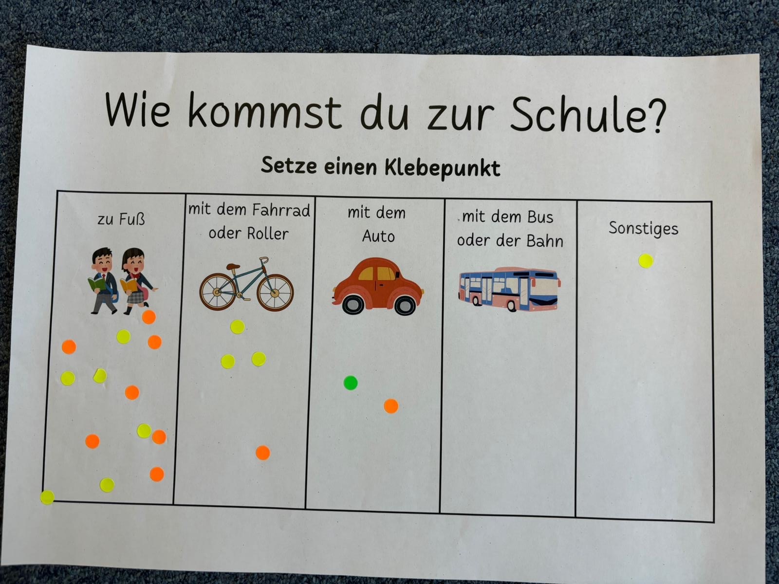 Wenn noch Zeit ist, kann zum Abschluss eine Umfrage durchgeführt werden, mit der sich recht schnell ein Gesamtbild für die ganze Klasse erstellen lässt (Umfrage Schulweg unter Materialien). Mögliche Fragen: Wie lang ist dein Schulweg? Mit wem kommst du zur Schule? Wie kommst du zur Schule? Bei jeder Frage können die Kinder zwischen mehreren Antwortvorgaben wählen und an der entsprechenden Stelle einen Klebepunkt hinterlassen.