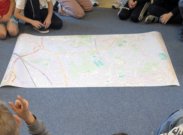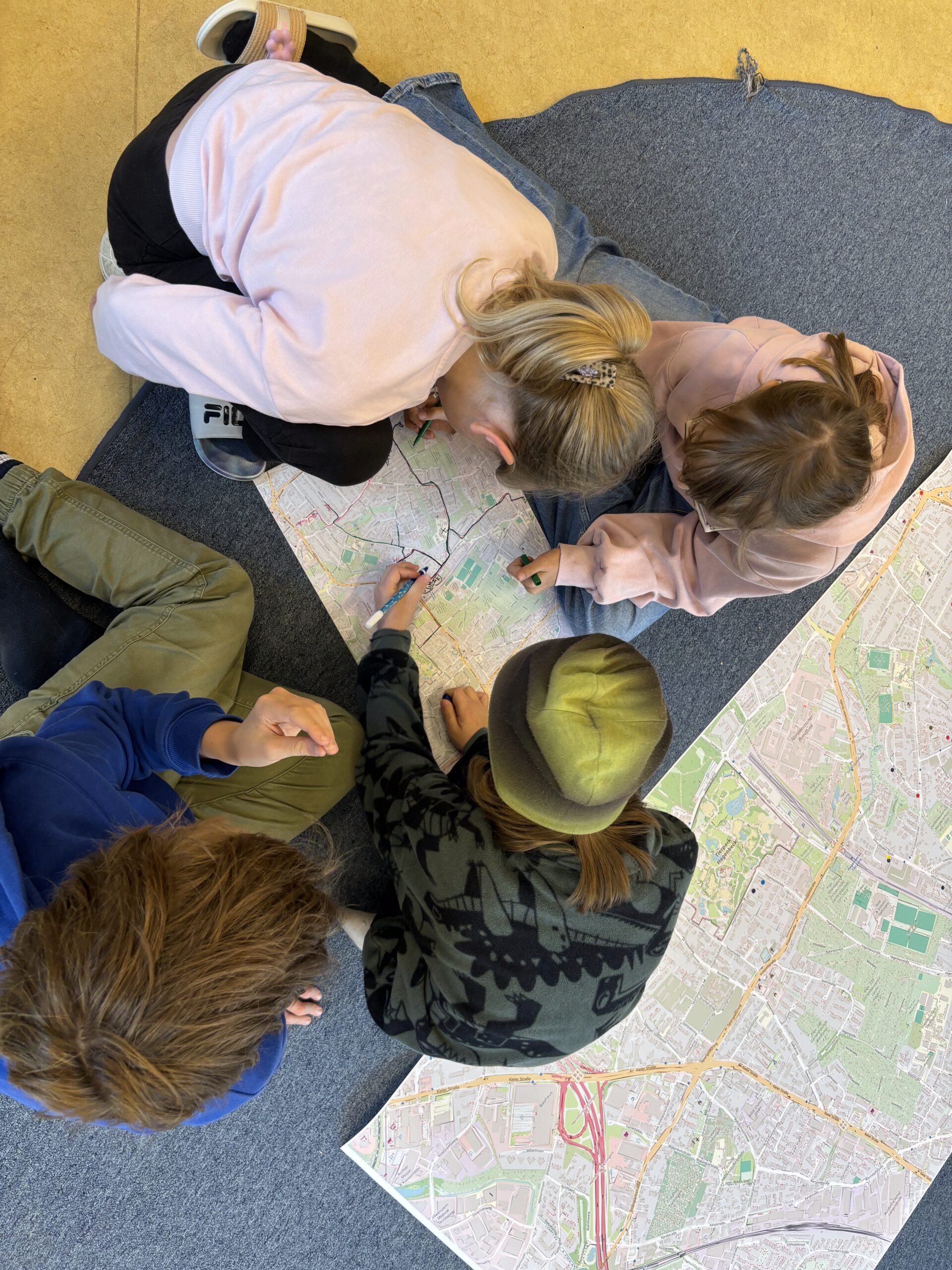 Anschließend arbeiten die Schüler:innen mit analogen Stadtteilkarten (DIN A2). In kleinen Gruppen tragen sie ihre Wohnorte ein, vergleichen ihre Wege und entdecken dabei Überschneidungen oder Unterschiede. Am Ende können die Kinder ihren Wohnort mit einem Klebepunkt (mit ihren Initialen) auf einer größeren Karte (DIN A1) markieren, die im Klassenraum aushängt. Durch das gemeinsame Betrachten der kleinen und großen Karten entwickeln die Kinder ein erstes Verständnis dafür, wie vielfältig die Schulwege sind, welche Orte für sie besonders wichtig sind und an welchen Stellen sie sich sicher oder unsicher fühlen (wichtige Erkenntnisse hierzu können auch in der Klasse visualisiert werden). Die Arbeit mit den analogen Karten soll die Kinder zudem dabei unterstützen, später bei der Erkundung ihres Schulwegs im Stadtteil ausgewählte Wege und Orte leichter zu finden. Eine kurze Auswertung – Was hast du Neues gelernt? – rundet den erste Projekttag ab.
