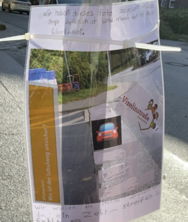 Die Sichtbarmachung von Ergebnissen im öffentlichen Raum bildet einen besonders wirkungsvollen Abschluss des Projekts. Sie fördert die Auseinandersetzung der Öffentlichkeit mit dem Thema Schulwegsicherheit und stärkt das Gefühl der Kinder, mit ihren Beobachtungen und Ergebnissen etwas bewirken zu können.