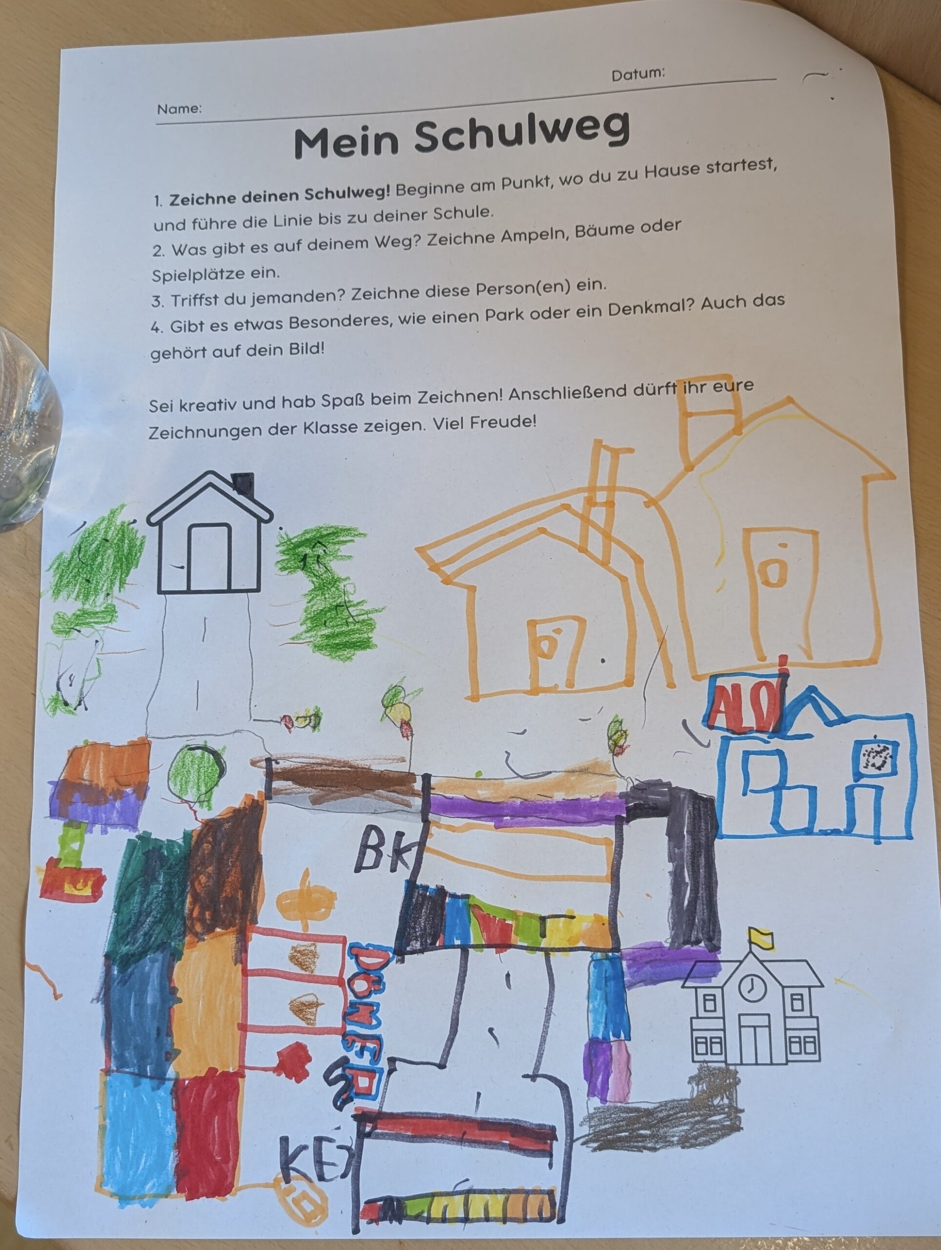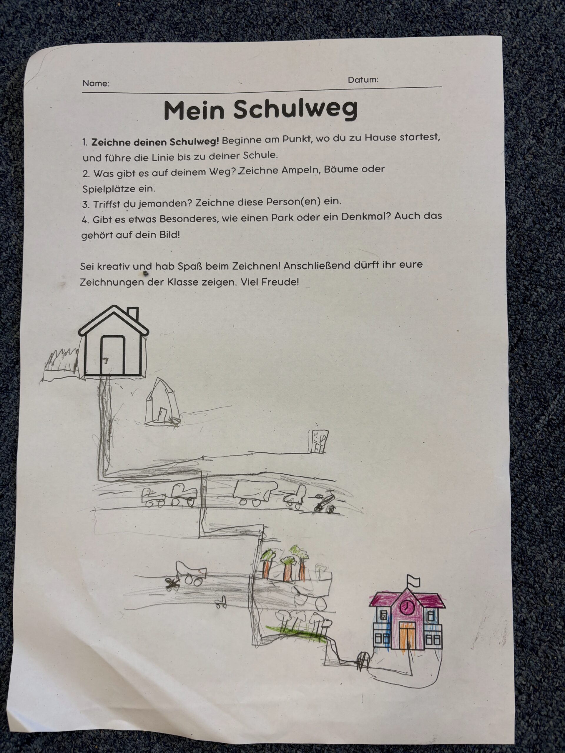 Zu Beginn des Projekts werden die Schüler:innen an das Thema Sicherheit auf dem Schulweg herangeführt. Ein motivierender Einstieg in das Thema gelingt mit einem Schulweg-Bingo (Schulweg-Bingo unter Materialien). Auf spielerische Weise erfahren die Schüler:innen dabei unter anderem, wer mit dem Fahrrad zur Schule kommt, wer einen weiten Schulweg hat oder wer eine große Straße überqueren muss. Eine intensivere Auseinandersetzung mit dem eigenen Schulweg ist möglich, wenn Schüler:innen ihren Schulweg zeichnen (Schulweg zeichnen unter Materialien). So wird deutlich, welchen Weg die Kinder täglich zurücklegen. Gleichzeitig können sie zeigen, welche Orte auf ihrem Weg liegen, wen sie treffen oder was ihnen sonst noch wichtig an ihrem Schulweg ist.