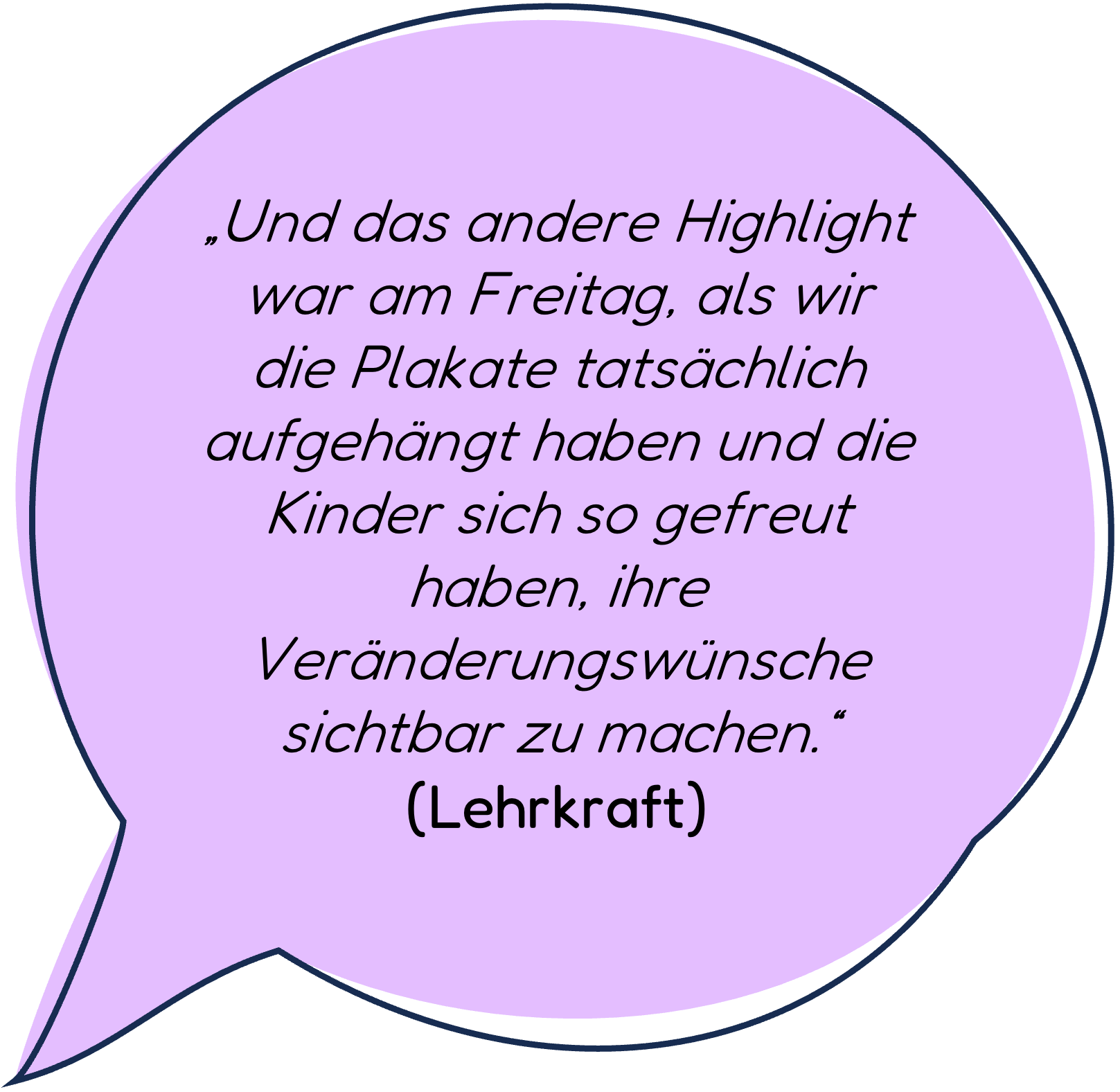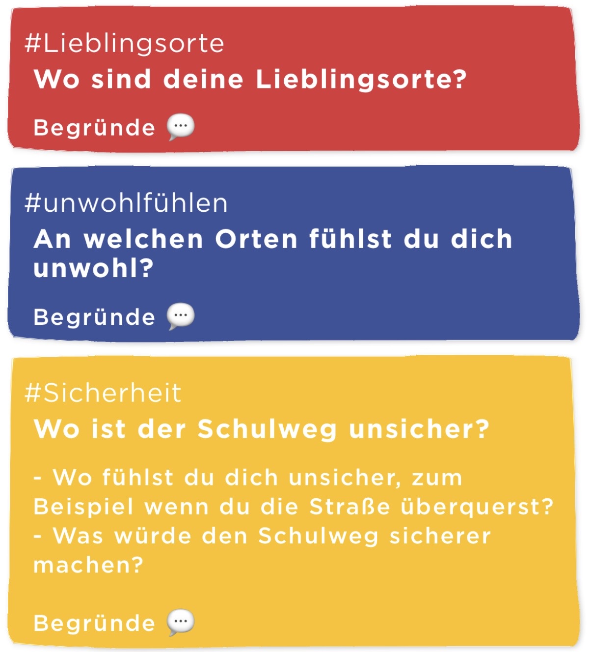 TIPP: Das Anbringen von Materialien im öffentlichen Raum sollte im Vorfeld stets mit der Schulleitung und – je nach Standort – auch mit der zuständigen Stadt oder dem Quartiersmanagement abgestimmt werden. Selbstverständlich können Ergebnisse auch in der Schule bei vielen Gelegenheiten präsentiert werden: etwa Schülerratssitzungen, Schulversammlungen, Elternabende oder in Form einer Ausstellung im Schulgebäude. Digitale Karten können dabei mit Postern kombiniert werden, die von den Kindern gestaltet werden.