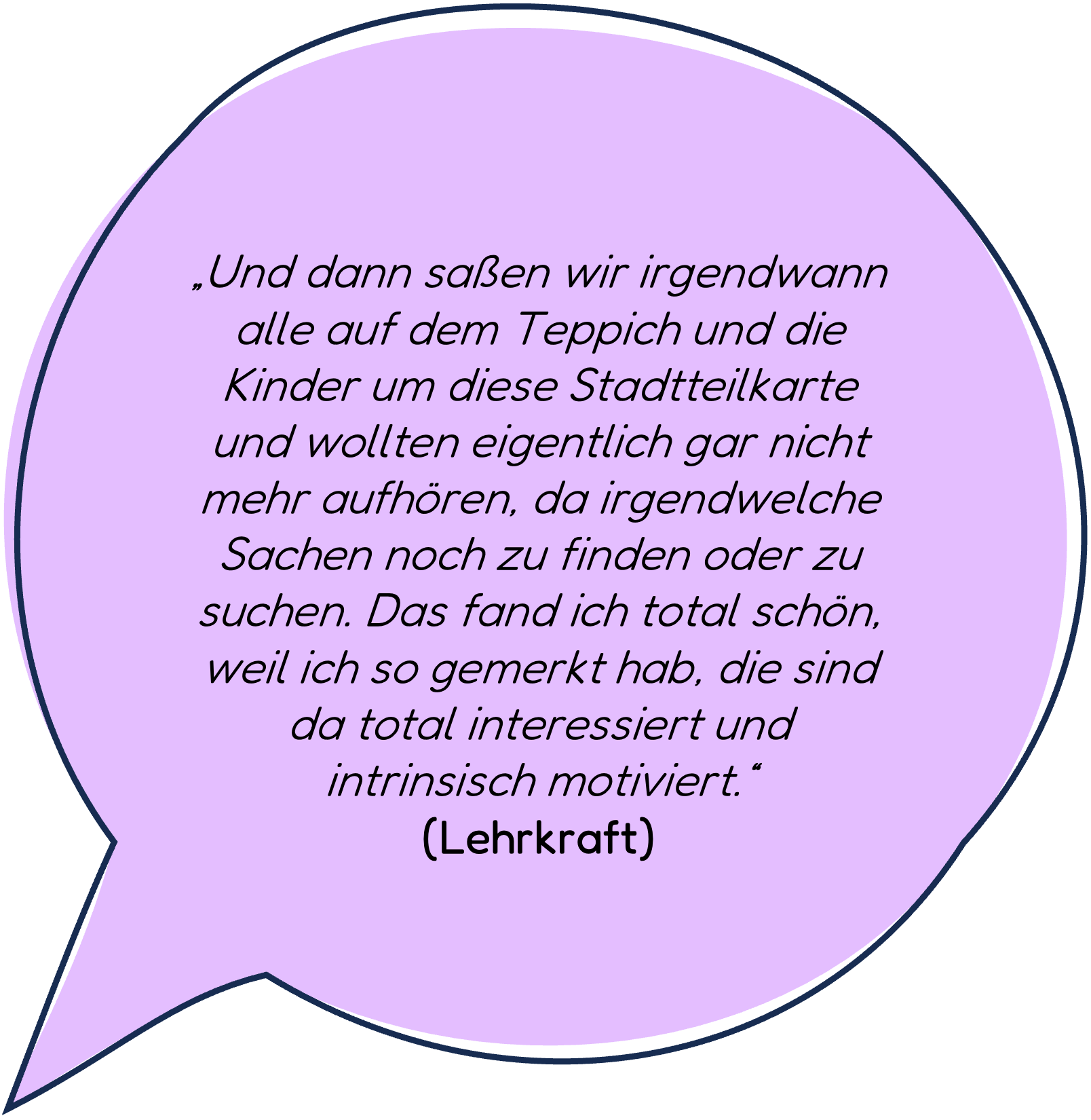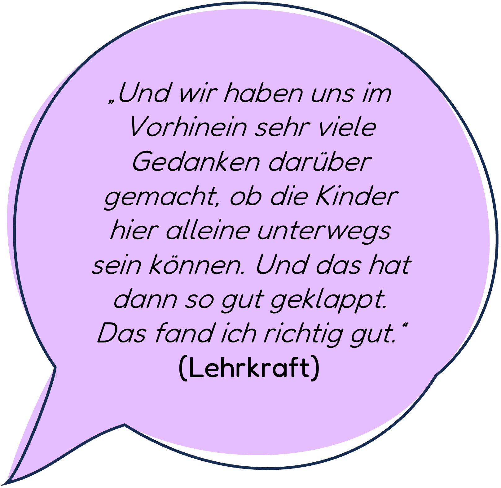 TIPP: Die Kinder sind stolz, wenn sie alleine im Stadtteil unterwegs sind und meistern diese Aufgabe in der Regel sehr gut. Trotzdem ist es hilfreich, wenn Lehrkräfte an vereinbarten Orten im Stadtteil bereitstehen, um bei Bedarf zu unterstützen. Auch Eltern können dabei eingebunden werden.