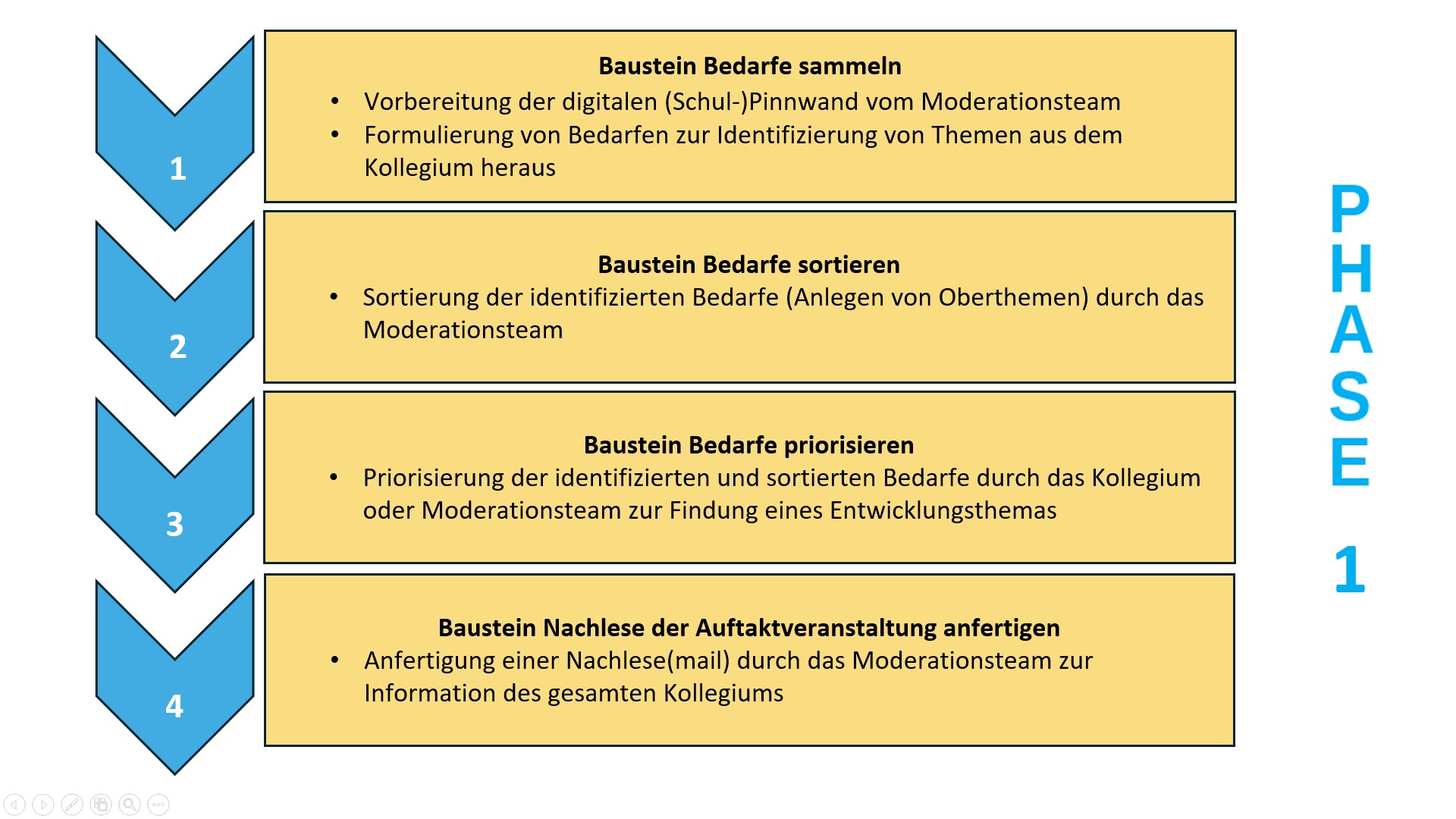 In der ersten Phase werden die Bedarfe auf Grundlage von Bedürfnissen oder Beobachtungen aus dem Schulalltag im Hinblick auf Verbesserungen oder Veränderungen aus dem Kollegium ermittelt. Damit identifiziert das Schulkollegium Schulentwicklungsbedarfe, um aus diesem Pool an Bedarfen zunächst ein Thema für den Schulentwicklungsprozess kollektiv auszuwählen und im weiteren Prozess gemeinsam zu bearbeiten.
