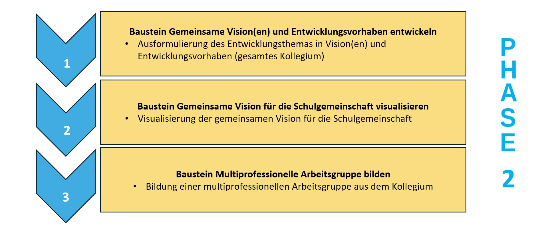 In der zweiten Phasen soll gemeinsam eine Vision entwickelt werden. Dabei wird der leitenden Fragestellung nachgegangen, welches Ziel am Ende des Schulentwicklungsprozesses erreicht werden soll. Aus dem in der ersten Phase ermittelten Thema und dem in dieser Phase festgelegten Ziel wird so eine konkrete Vision (Entwicklungsvorhaben) formuliert.
