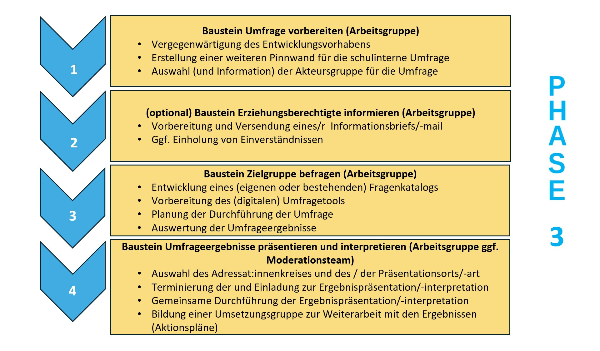 In der vierten Phase werden Aktionspläne auf Basis der interpretierten Ergebnisse der zuvor durchgeführten Umfrage entwickelt. Dabei soll die in der zweiten Phase gemeinsam entwickelte Vision im Blick behalten werden. Die Aktionspläne unterstützen dabei, die Umsetzung zu konkretisieren und priorisieren.