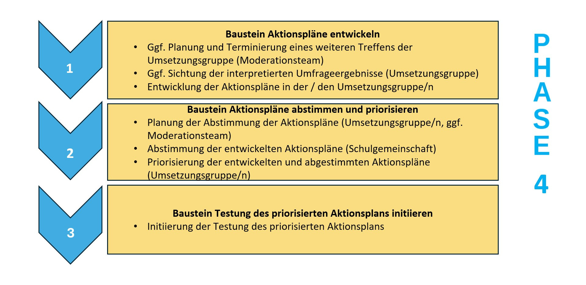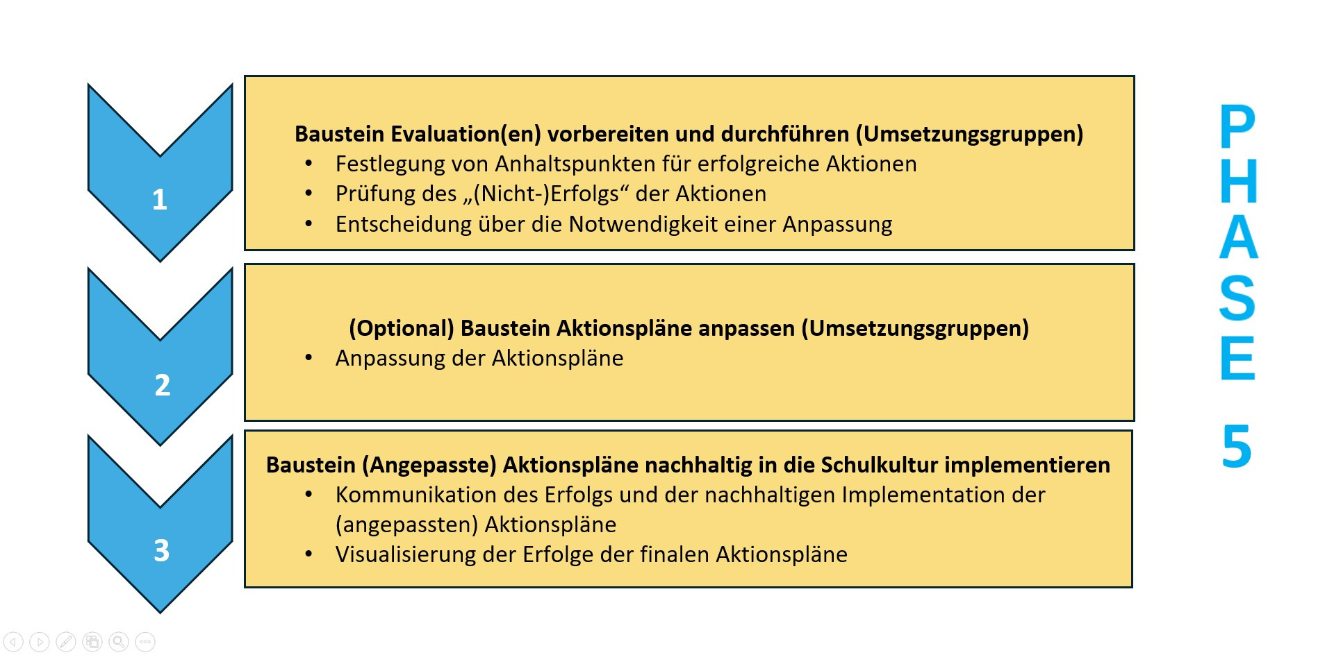 In der fünften Phase geht es darum, die zuvor entwickelten Aktionspläne in die Schulkultur zu implementieren, um in einem zweiten Schritt mittels Evaluation(en) mögliche Stolpersteine zu identifizieren und ggf. die Aktionspläne bzw. deren Umsetzung anzupassen. Dabei soll es auch um die Frage gehen, ob das Ziel des Entwicklungsvorhabens erreicht wurde.