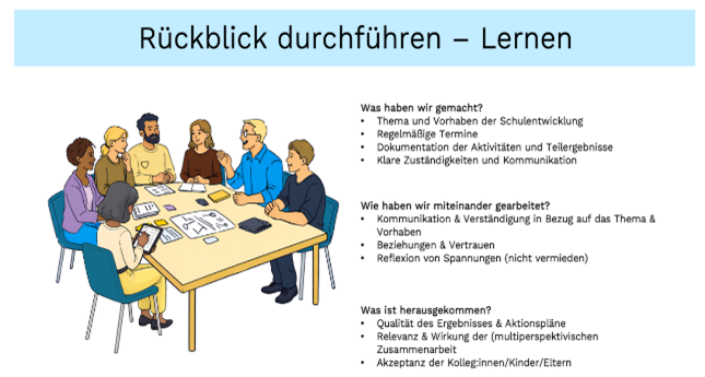 Die Umsetzung der Aktionspläne sowie mögliche Anpassungen sollten zu beobachtbaren Veränderungen und Entwicklungen in der Schulkultur geführt haben. Damit ist der Schulentwicklungsprozess hinsichtlich des gewählten Themas abgeschlossen. Abschließend soll der „Blick zurück nach vorne“ gerichtet werden, um vollzogene Entwicklungen wahrzunehmen und wertzuschätzen.